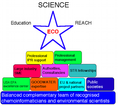 The expertise of ECO members ranges from experimental groups working from traditional analytical techniques (IFAR, HMGU) to modern bioscreening methods using unicellular eukaryotes (Tetrahymena species), fungi (S. cerevisiae) (HMGU), multicelluar eukaryotes algae, daphnids (RIVM) as well as fish lines (INIA, RIVM). The computational expertise ranges from molecular mechanics (CSIC, HIK) to semi-empirical and ab initio quantum chemical calculations (CSIC, IEC, UMB). The expertise in chemoinformatics methods ranges from multivariate methods (HIK) to modern non-linear approaches (HMGU) and genetic methods (UMB). The range of addressed problems ranges from prediction of physico-chemical end-points (HMGU), simple toxicological end-points (HIK, UMB) to complex problems of metabolism and biodegradation (IFAR), prediction of properties of complex mixtures (RIVM, HMGU), fate modeling and exposure assessment (RU, RIVM) and assessment of nanomaterials. This expertise would not be possible without excellent technical equipment of groups, thanks to their location in leading centers in their countries. This expertise creates a scientific fundament of ECO, which has received multiple validations by excellent scientific records of group leaders and their participation to prestigious EU and national grants.